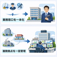 多くの場合、事業者は複数の営業拠点を所有しています。これら複数の拠点を私たちにアウトソーシングすることで、管理手法の統一による横串の通った高度なマネジメントの実現や、施設運営データや災害情報等の迅速なデータ集約を、事業者本社の担当者様が本社に居ながらにして行うことが可能となります。