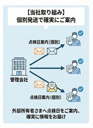 そこで私たちは、現地のお知らせの掲示以外に居住されていないオーナー様に向けて点検日のご案内を個別発送し、確実に情報をお届けできる仕組みを整えています。
